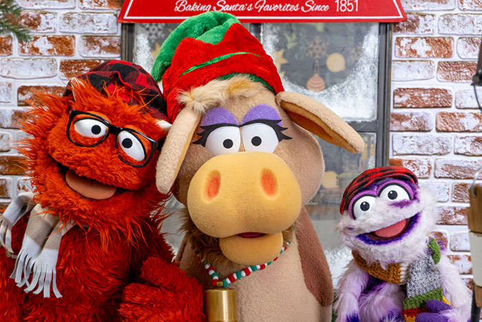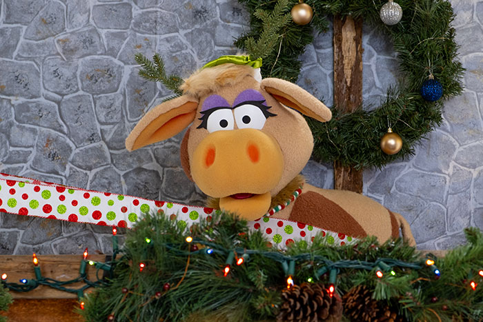 A three-shot of Daisy the Christmas Cow with Sam and Murphy, celebrating friendship and Christmas fun at the North Pole Barn.